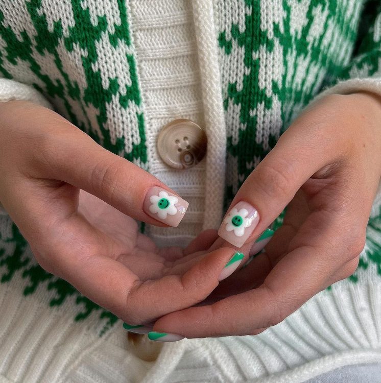Зелений френч можна модернізувати. Потрібно лише обіграти колір та намалювати квіти на великих нігтях.