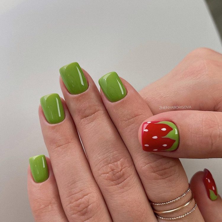 Оливковий манікюр можна урізноманітнити малюнком. Щоб не перенавантажувати образ, декор краще зробити на одному нігті. Чудово підійде полуничний принт.
