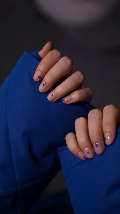 Грайливий та безтурботний дизайн для волелюбних людей та тих, хто обожнює яскраві пригоди. Кобальтові цятки і смужки на «голому» нігті можна порівняти хіба що з літнім днем на пляжі, коли океанські хвилі плескаються біля ваших ніг.