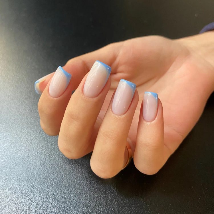 Незвичайний та сучасний варіант класичного французького манікюру для тих, хто не уявляє свого життя без моди. Нюдовий топ і блакитні куточки – це все одно, що ходити вулицями галасливого мегаполісу, безсоромно виділяючись з натовпу.