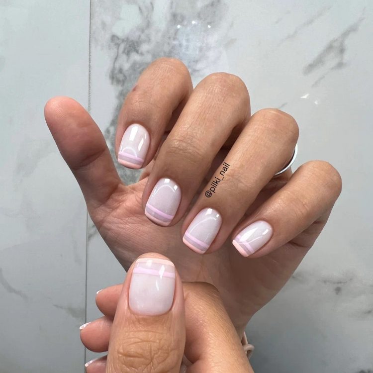 Спокійний та безтурботний манікюр для тих, хто цінує моменти турботи про себе та внутрішнього спокою. Дизайн з негативним простором і пастельними хвилями нагадує безтурботне усамітнення на березі озера, де поверхня води відображає м’які відтінки сонця.