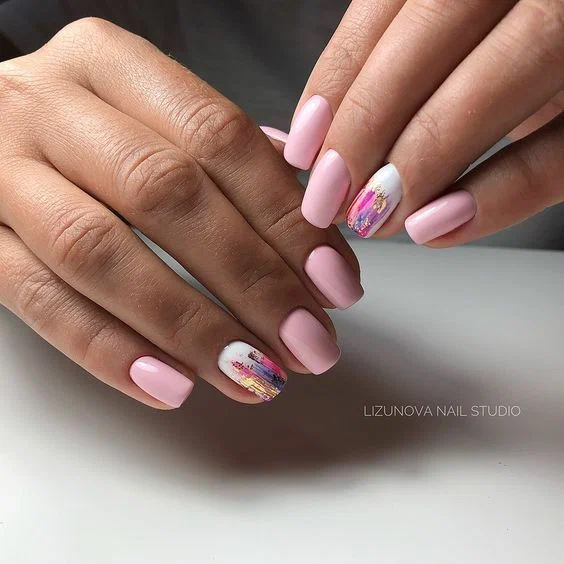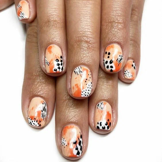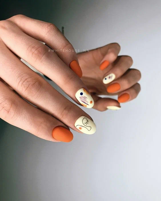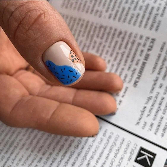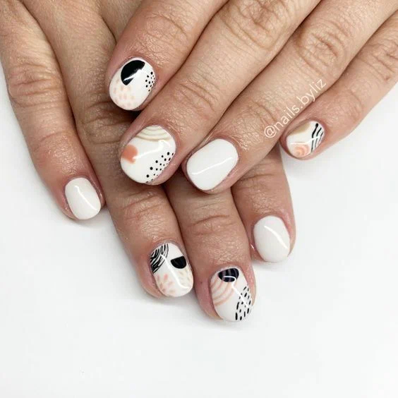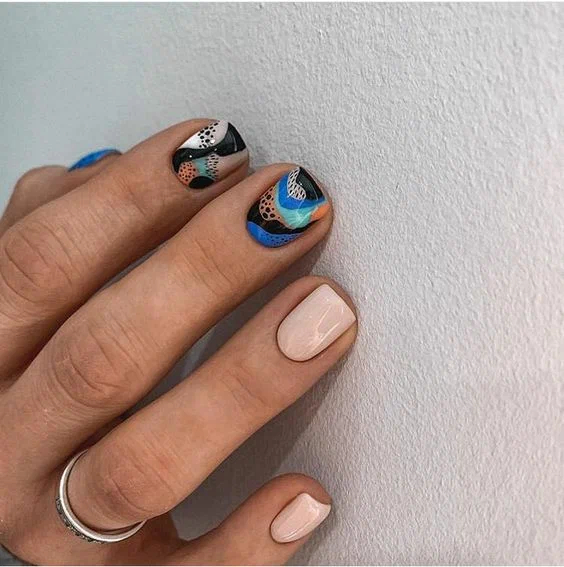 Не обов’язково прикрашати кожен ніготь виразним малюнком, достатньо розфарбувати лише кілька, залишивши всі інші однотонними. Щоб абстракцію не перевантажити, нейл майстри рекомендують фарбувати нігті без дизайну в спокійніші відтінки, відмінно підійдуть всі відтінки палітри бежевий.