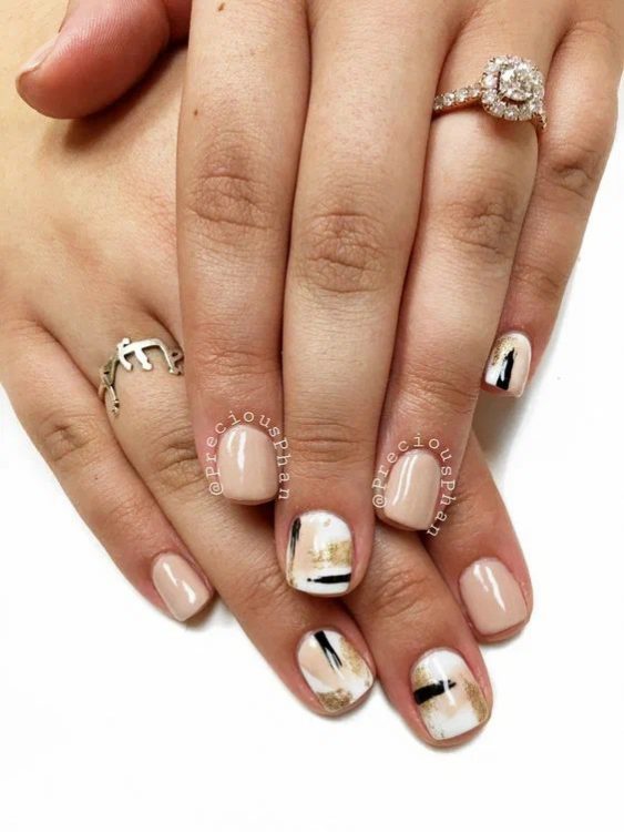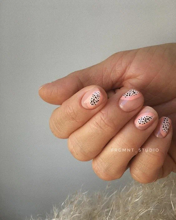 Нюдові відтінки чудово перегукуються між собою, якщо вибрати правильні кольори та доповнити їх чорними акцентами у вигляді точок, смужок, кіл та інших довільних штрихів.