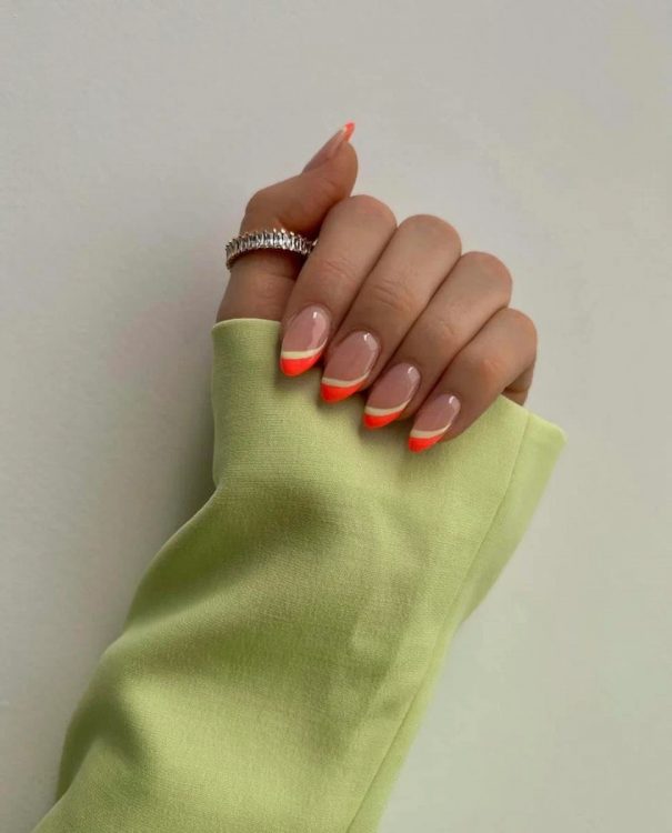 Асиметричні французькі кінчики яскравих відтінків ідеально підійдуть для створення сміливого та грайливого образу. Цей простий та життєрадісний дизайн просто створений для пляжного відпочинку.