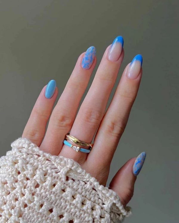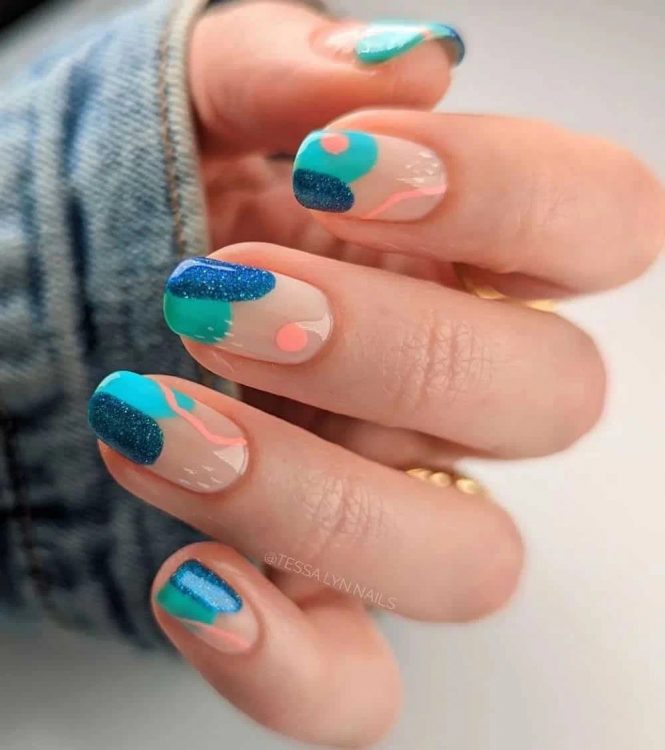 Гарні блакитні хвилі на нігтях ідеально підійдуть для пляжного відпочинку. Матовий фініш на коротких нігтях виглядає стильно та витончено. Однак ви можете використовувати глянсовий топ і трохи блискіток, щоб зробити дизайн грайливішим.