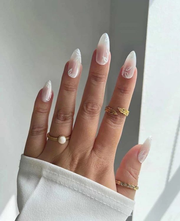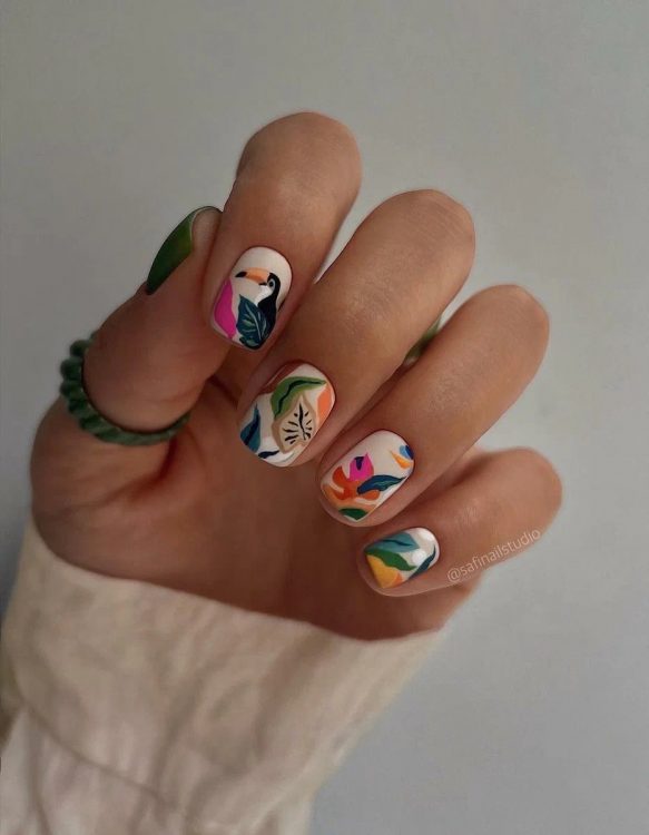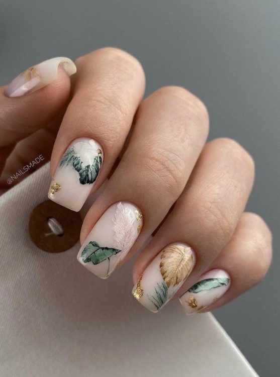 Якщо ви шукаєте ідею вишуканого манікюру з літнім настроєм, спробуйте цей елегантний тропічний дизайн. Молочно-біле покриття – ідеальна основа для смарагдово-зеленого та золотого листя. Щоб зробити ваші нігті ще більш розкішними, додайте трохи фольги.