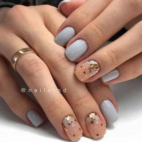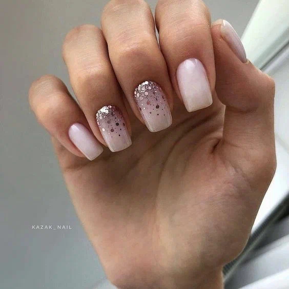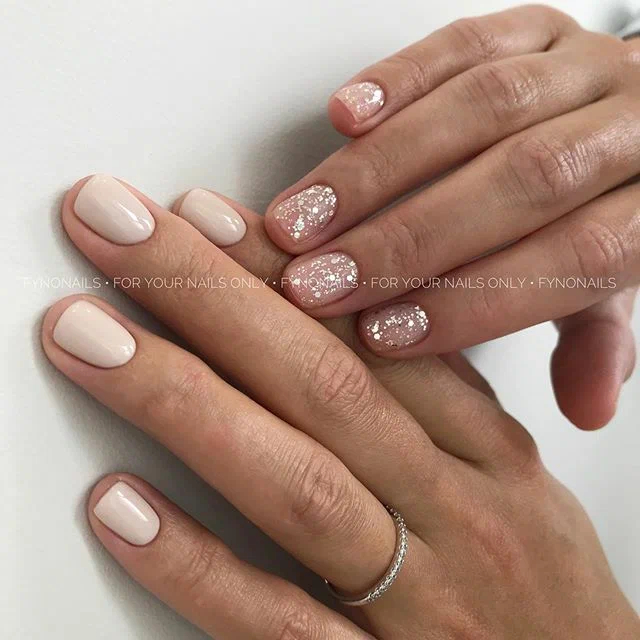 Блискітки на нейтральному нюдовому фоні – ніжний і головне швидкий дизайн манікюру, який підійде під будь-яке стилістичне вбрання.