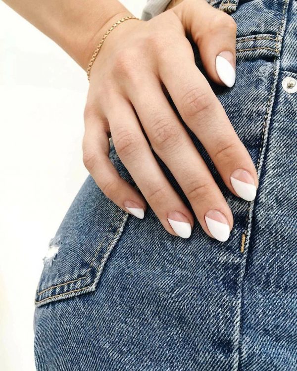 Як варіант ліву руку можна залишити з білою чи молочною базою, а ось праву прикрасити прозорим лаком із дрібними блискучими частинками.