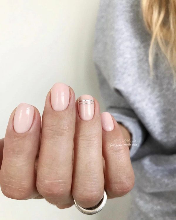 Пастельно-рожевий + кілька срібних смужок – ідеальний тандем на всі часи. Цей привабливий відтінок лаку чудово підкреслить засмагу шкіри, а також зробить ручки молодими та доглянутими.