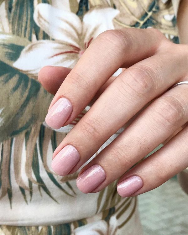 Молочно-рожевий з дрібними блискучими частинками – ще один запаморочливий тренд, який робить жіночі ручки охайними та елегантними.