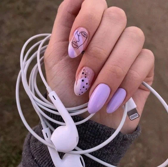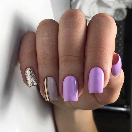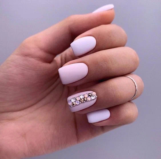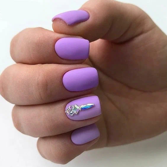 Матовий лавандовий, а також бузковий колір гармонійно впишеться у привабливі літні дизайни. Цей колір лаку можна залишити в однотонному виконанні, а також урізноманітнити доріжкою зі стразів різного розміру.