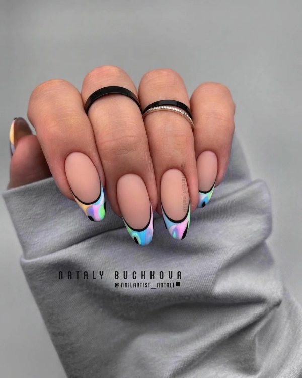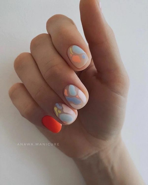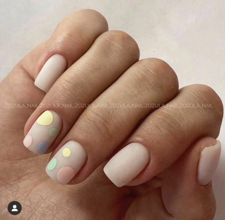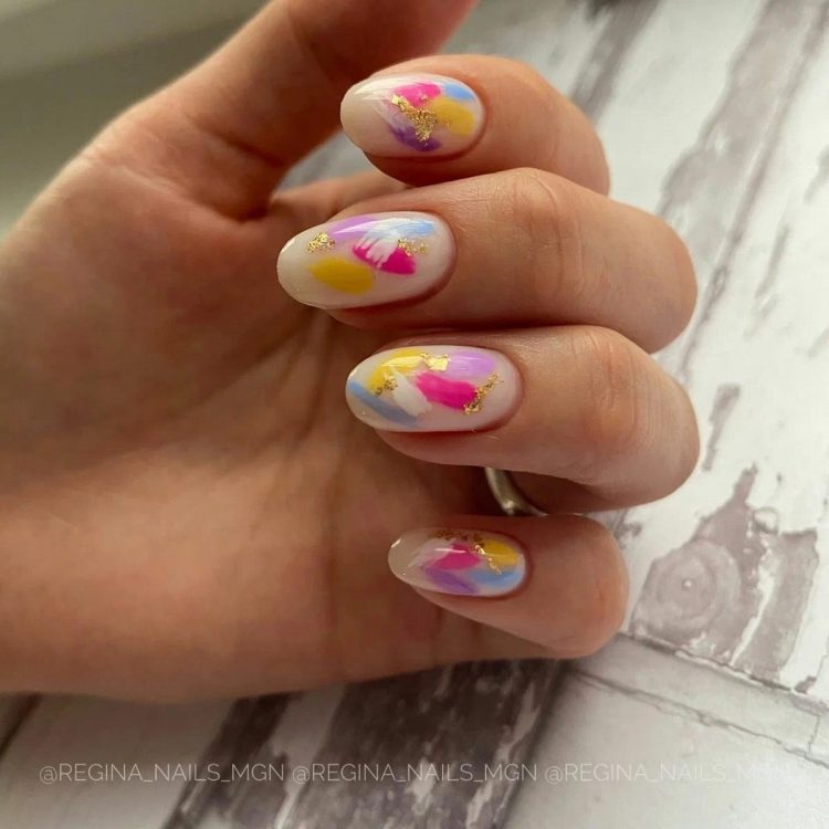Якщо до натуральних відтінків додати мікс у вигляді бузкового, малинового, блакитного, жовтого та золотистого мазків, то манікюр заграє новими, літніми фарбами.