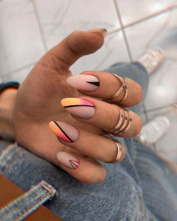 Не менш цікавими є геометричні фігури та різні лінії на нігтьових пластинах, оформлені в техніці “колор-блок”, що дозволяють урізноманітнити будь-який манікюр.