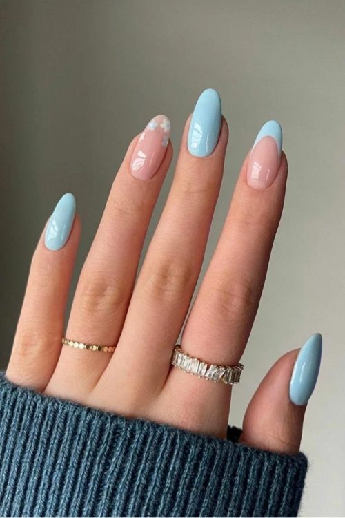 Ніжний манікюр у блакитних відтінках незмінно користується популярністю у весняний та літній сезони, дозволяючи модницям виглядати елегантно та сучасно.