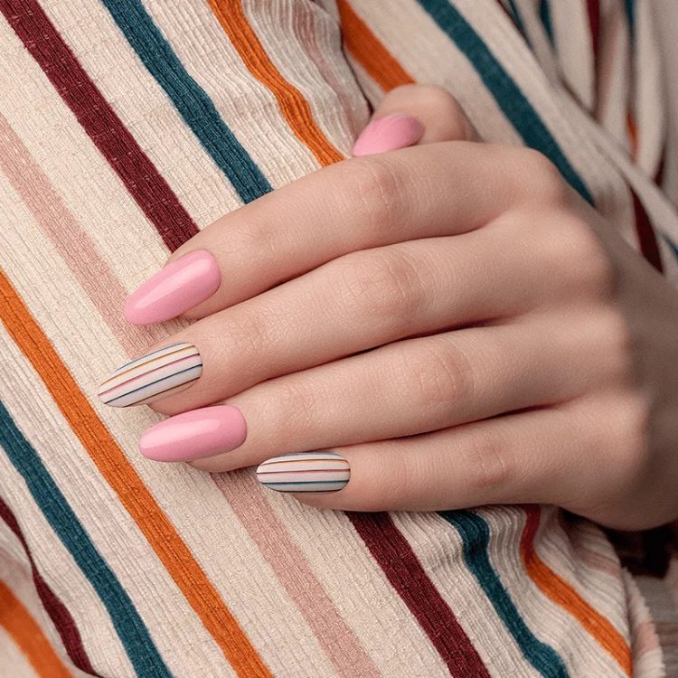Любителькам спокійної кольорової гами, що віддають перевагу довгим нігтям овальної форми, варто звернути увагу на оформлення у вигляді тонких різнокольорових ліній, завдяки яким манікюр виглядає більш оригінальним.