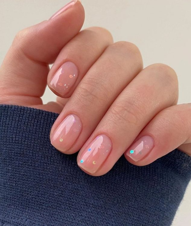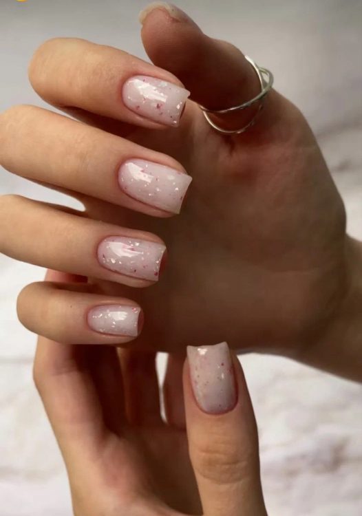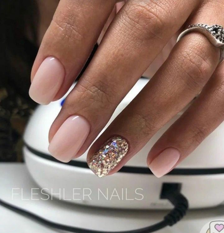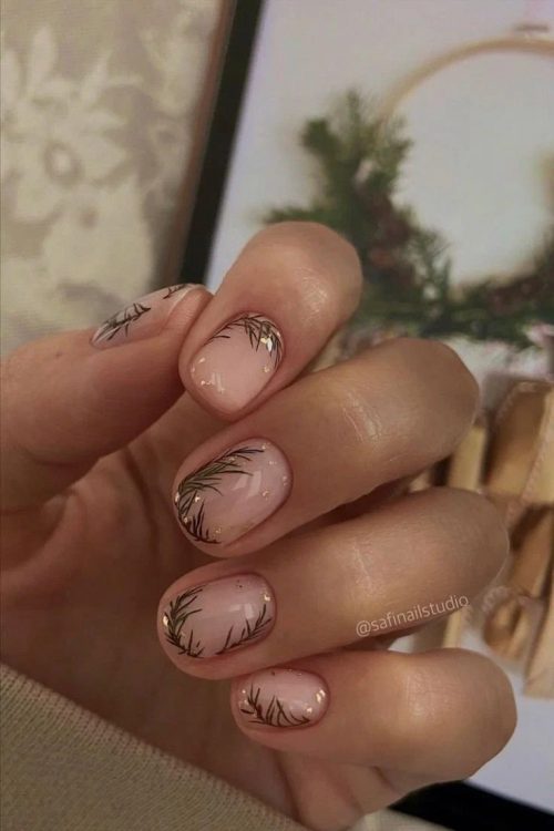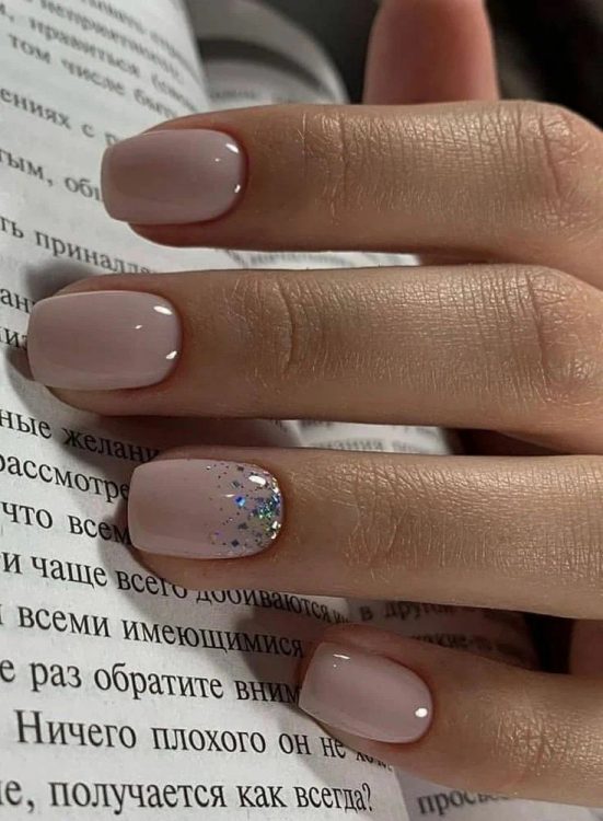 Новорічний манікюр не обов’язково має бути яскравим. Манікюр, виконаний у нюдових відтінках – безпрограшний варіант для будь-якого випадку у житті. Додати святковості манікюру можна за допомогою блискіток, гліттера, фольги або каміфубукі.