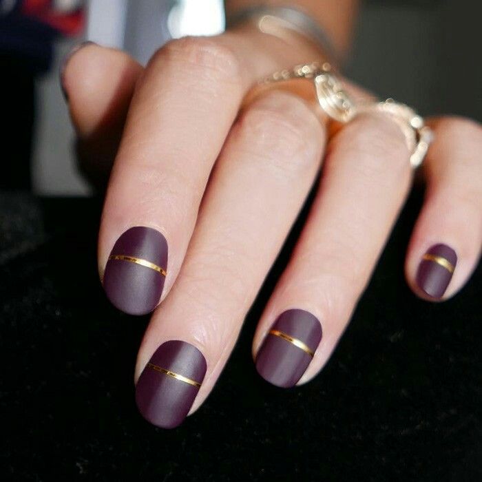 Темний бордовий, сливовий або винний відтінок лаку і тонка золота смужка посередині – оптично такий манікюр звужує та подовжує нігті, роблячи їхню форму більш гармонійною.