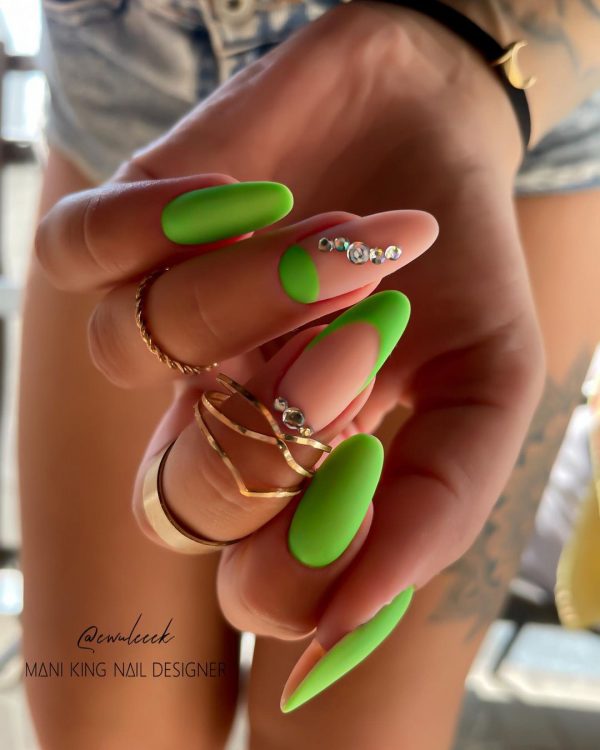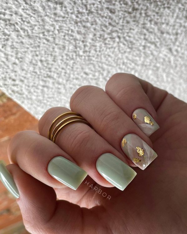 Зелена гамма чудово виглядає в осінньому образі жінки. Ідеальний відтінок цього сезону – приглушений зелений, оливкові тони та колір хакі. Із цими відтінками можна робити як офісний, так і урочистий манікюр.