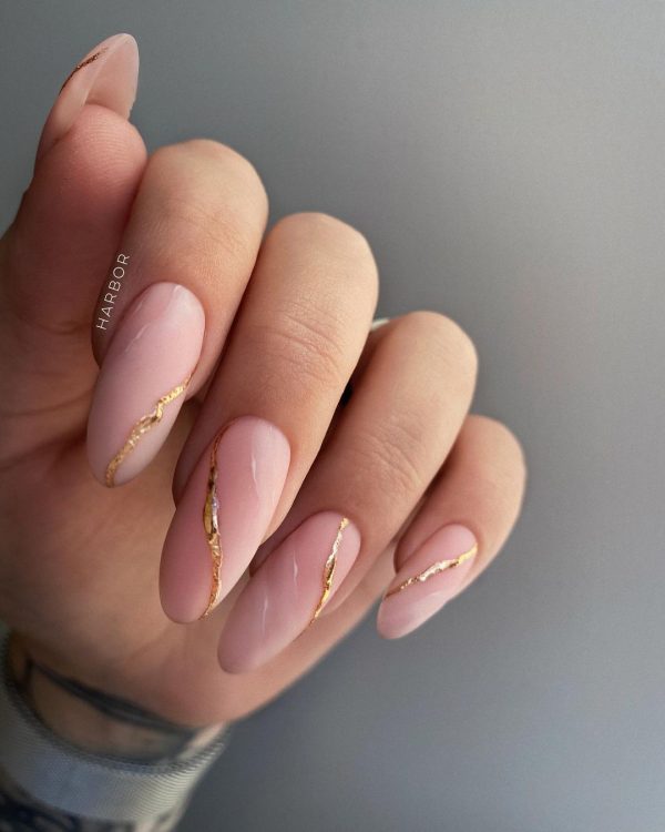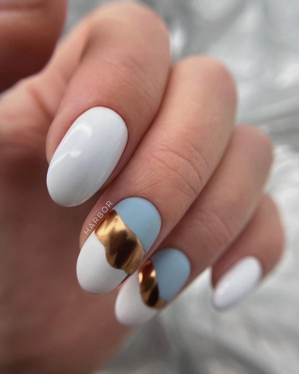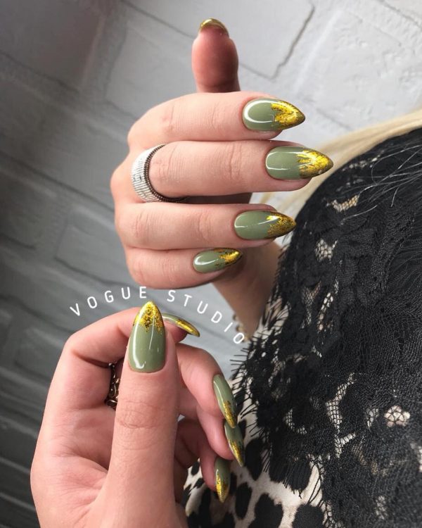 Для стильного осіннього манікюру необхідно додати до дизайну золоті вставки. Розкішніше і яскравіше виглядає золота фольга, яка може знаходитися в будь-якій області нігтьової пластини. А загальний фон стильного дизайну вибирають будь-який.