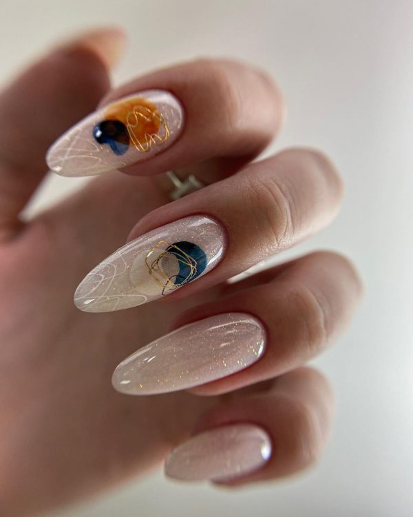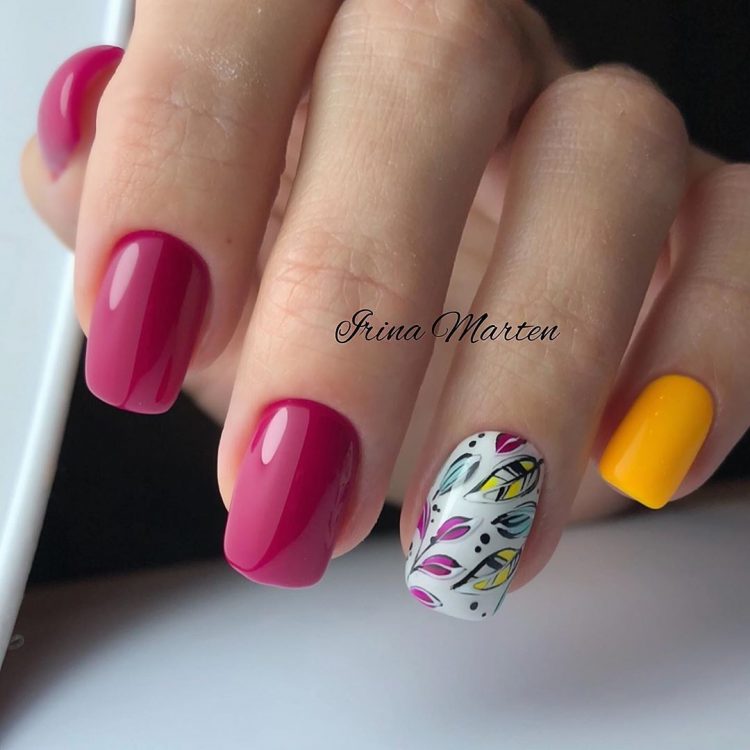 Звичайно, без малюнків цієї осені не обійтись. Як і раніше, у тренді листочки в червоних, жовтих і помаранчевих кольорах, які можна оточити базовим кольором лаку. Також з допомогою листочків можна створити модну абстракцію на ваших нігтях.