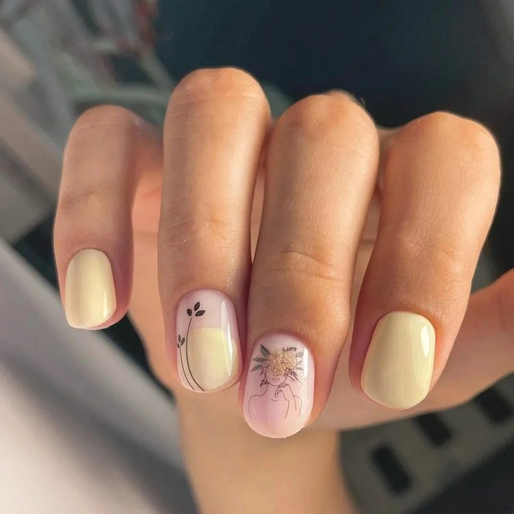 Ніжні пастельні відтінки в нейл-арті давно стали всесезонною класикою, до якої вдаються мільйони жінок у всьому світі. Рожевий+жовтий+мінімалістичні малюнки – чудове поєднання!