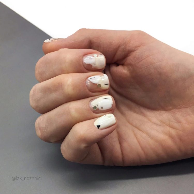 Манікюр з відтінками білого виглядає ефектнішим, якщо в ньому є не тільки мінімалістичний декор, а й натуральні бежеві відтінки.
