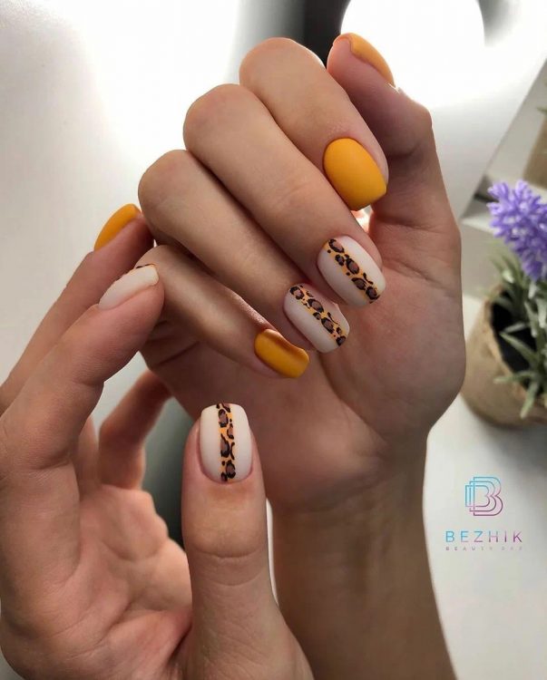 Якщо хочеться трохи яскравості, варто вибрати манікюр з яскравими деталями і відтінками. Наприклад, жовтий колір + леопардовий принт.