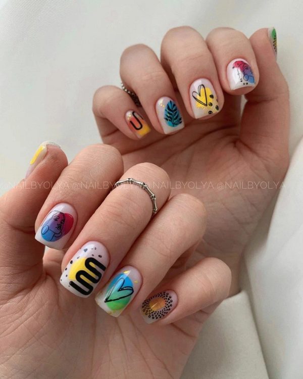 Стильна абстракція на нігтях стала класикою будь-якого сезону. Влітку, як правило, модниці вибирають більш акцентні та яскраві за кольором варіанти.