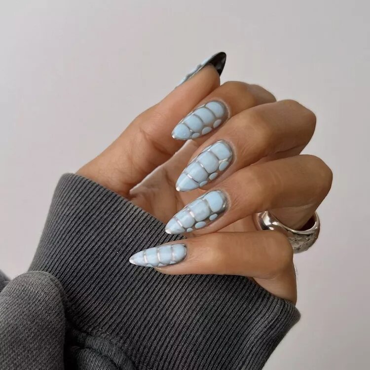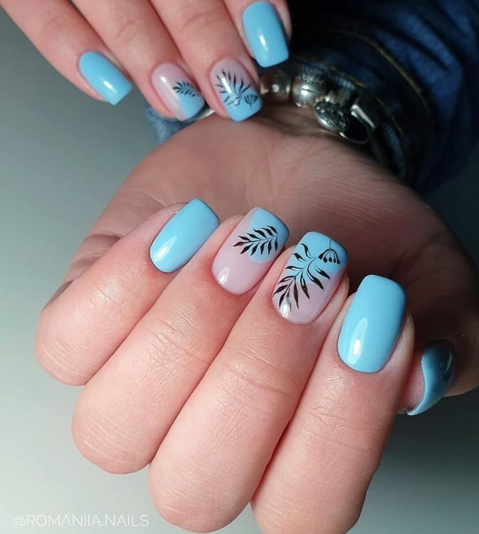 Ці світло-блакитні нігті з акцентом у вигляді листя виглядають дуже ніжно та витончено. Чорний колір малюнків красиво контрастує з блакитним тлом. Незважаючи на свій весняний настрій, цей дизайн чудово підійде і для холодної пори року.