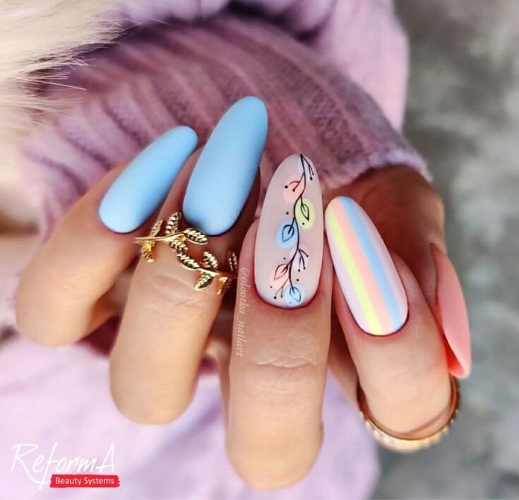 Ніжне поєднання світло-блакитного кольору та райдужної комбінації пастельних відтінків робить цей манікюр милим, життєрадісним та чарівним. Він підніматиме вам настрій протягом усього дня.