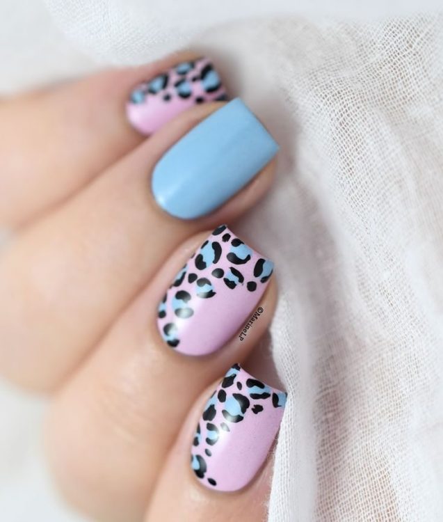 Дизайн нігтів з анімалістичним принтом може бути ніжним, якщо вибрати для нього світло-блакитну палітру.