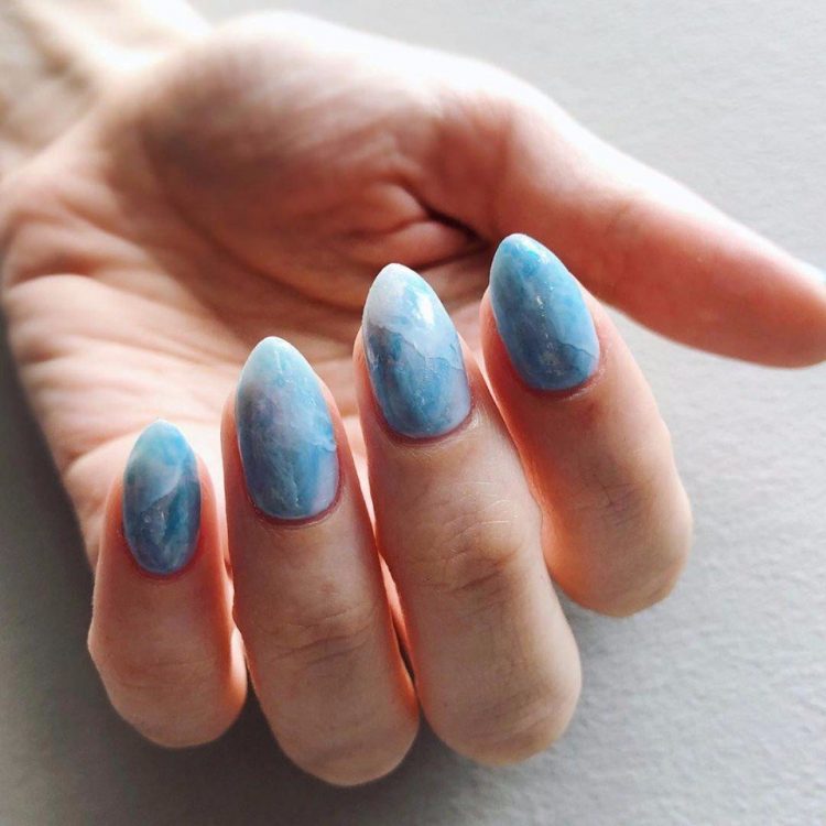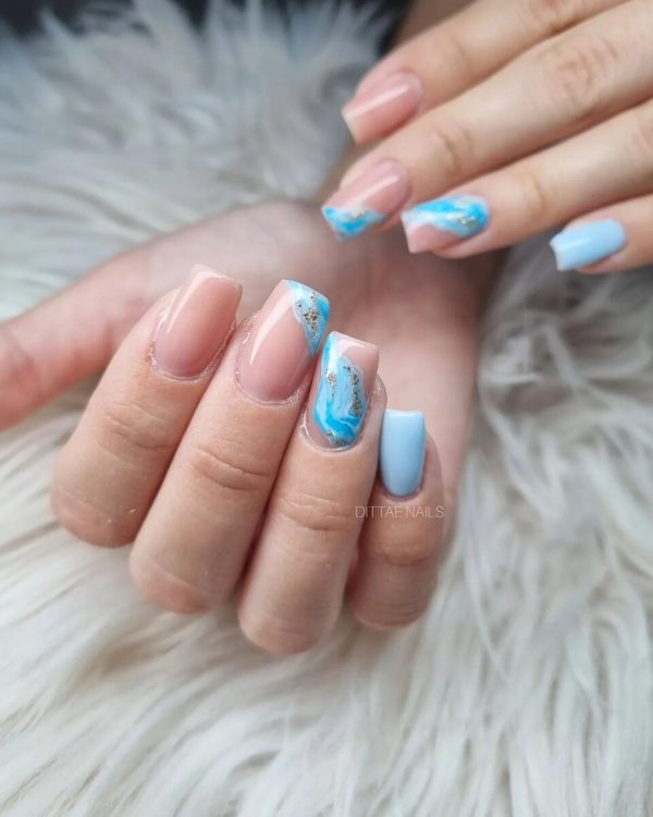 Щоб отримати чарівний та ефектний манікюр, намалюйте на нюдовій основі легкі мармурові розводи блакитного кольору та додайте трохи золотої поталі для делікатного блиску.