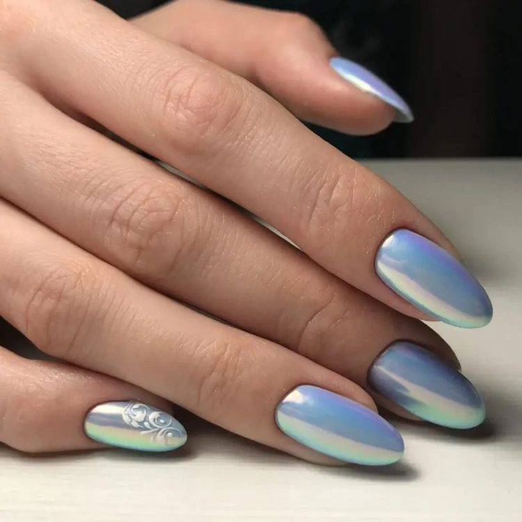 Головна особливість цього блакитного манікюру – загадковий блиск хромованого покриття. Такий дизайн не вимагає додаткових прикрас, ваші нігті і так будуть гарно виблискувати на світлі.