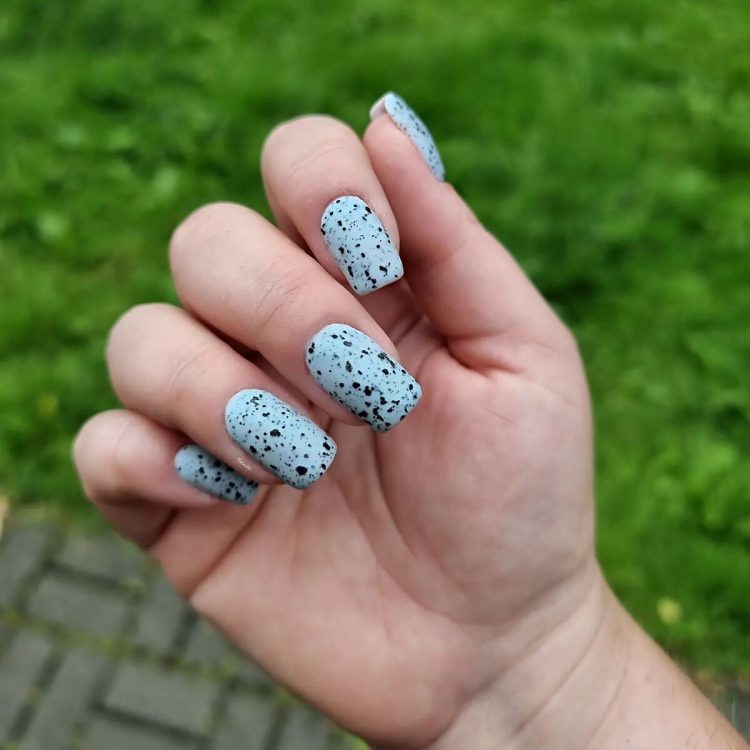 Матовий топ змушує глянути на звичні кольори по-новому. Блакитний відтінок не є винятком цього правила. Пожвавити однотонне покриття можна малюнком “перепелине яйце” у вигляді чорних крапок.