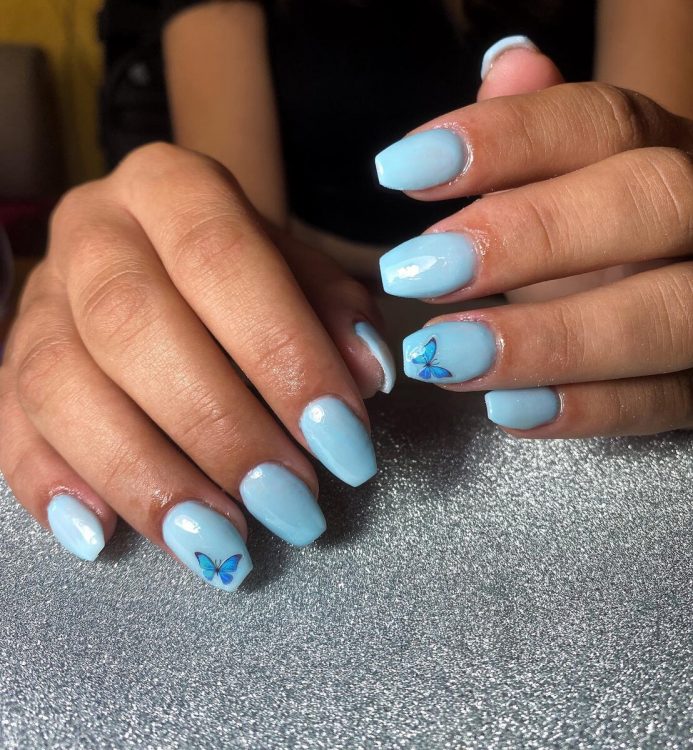 Світло-блакитний відтінок ідеально підходить для коротких квадратних нігтів. Щоб зробити дизайн цікавішим, достатньо додати невеликі сині метелики на нігті безіменних пальців.