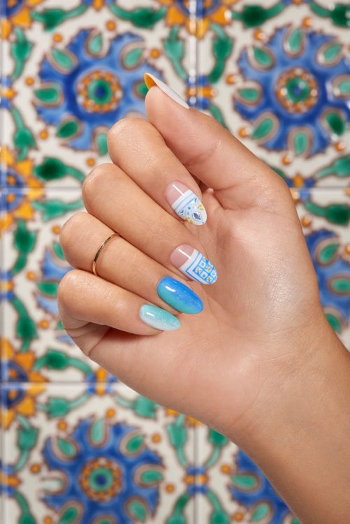 - жовто-блакитні – оптимальний вибір для поєднання з теплими тонами у манікюрі.