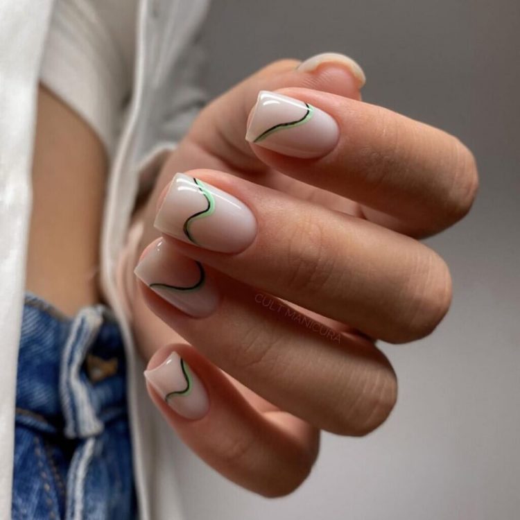 Не менш популярним є дизайн нігтів з кривими лініями або хвилями, які можуть прикрашати будь-яку нігтьову пластину. У мінімалістичному манікюрі ці лінії, як правило, дуже тонкі та виконані з лаків непомітних відтінків.