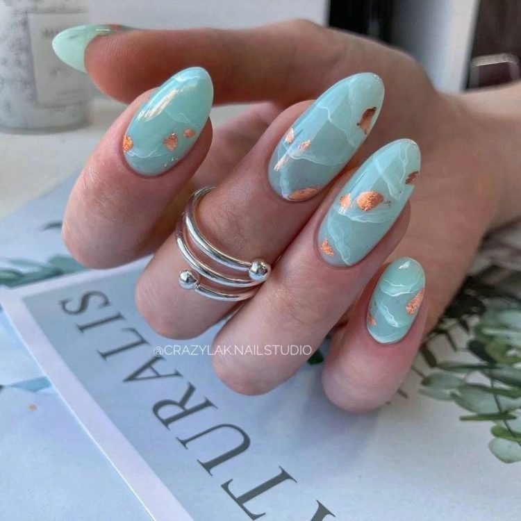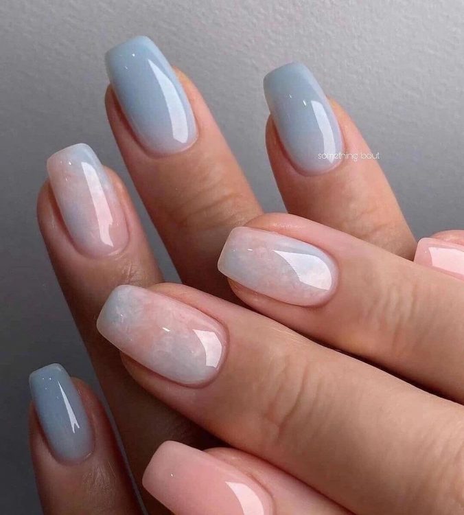 Ніжні блакитні відтінки чудово виглядають у мармуровій техніці нанесення, в цьому випадку їх краще комбінувати з бежевими, рожевими або білими кольорами.