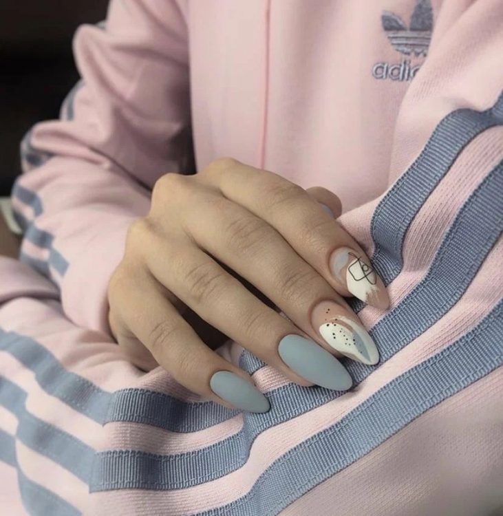 Неймовірно стильно і ніжно виглядає манікюр у блакитних відтінках з додаванням бежевих тонів, мінімалістичних малюнків та блискучих точкових вкраплень.