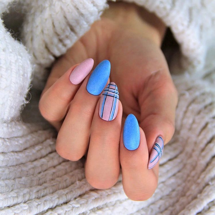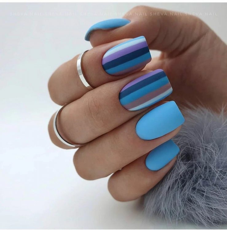 Для створення більш контрастного манікюру варто додати до блакитного кольору насиченіші відтінки: синій, фіолетовий, коричневий, чорний у вигляді стильних смужок.
