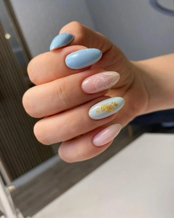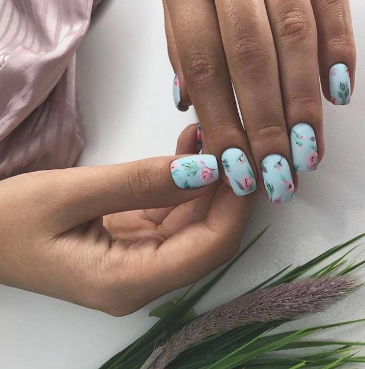 Любителькам флористичних візерунків можна сміливо вибрати манікюр у блакитних відтінках з додаванням улюблених кольорів як у натуральному зображенні, так і в мінімалістичному.