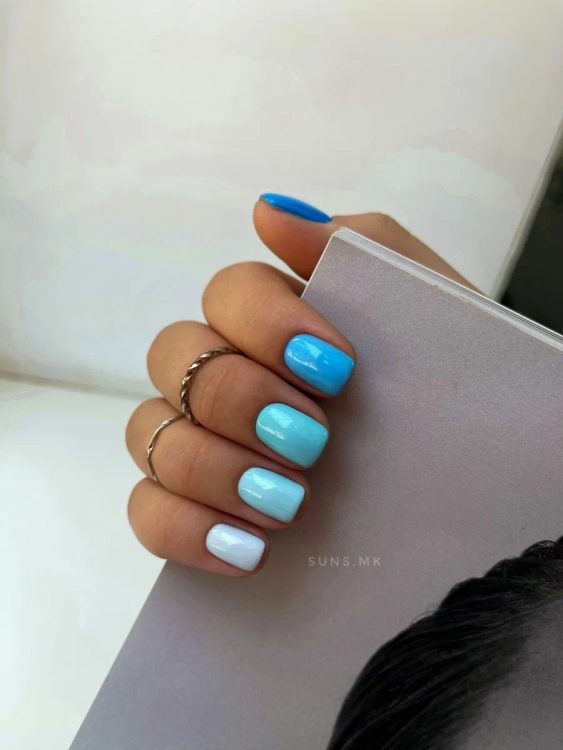Манікюр у ніжних блакитних відтінках користується популярністю протягом усього року, але з кожним сезоном змінюються деякі деталі: взимку блакитні відтінки найчастіше комбінують з білими, влітку – з яскравими, восени з’являються глибші тони, весною – пастельні. Не варто забувати також про тематичні малюнки, які змінюються зі зміною пори року. Але наразі у нас на вулиці літо, і блакитні відтінки часто є сусідами яскравіших забарвлень або малюнків.