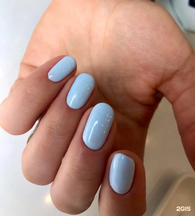 Втім, найпростішим і, водночас, стильним дизайном можна назвати однотонний манікюр у ніжних блакитних тонах із ледь вловимим сяйвом.