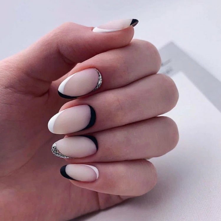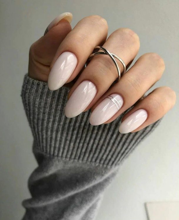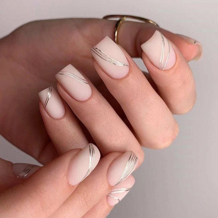 За формою – це повна протилежність попереднього варіанту, але нічим не гірша. Деякі жінки віддають перевагу короткій довжині для зручності, але це виглядає дуже мило і естетично. Колірна гамма досить спокійна, з додаванням елементів гліттера, що виглядає дуже гламурно та стильно. Такий варіант підійде кожній жінці, котра любить спокійний, нюдовий манікюр. На фото ми бачимо також дизайн зі смужок фольги, цікавий варіант, який виглядає дуже естетично.