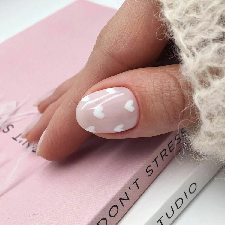Так-так саме серця завоювали серця багатьох жінок. Досить стриманий варіант, але завдяки малюнку виглядає дуже цікаво. На фото дизайн представлений у формі овал, також це може бути гострий квадрат або балерина, виглядатиме дуже виграшно. Топовим рішенням стали саме серця, які завоювали серця багатьох жінок. Зараз ми можемо бачити такого плану манікюр на багатьох представницях прекрасної статі.