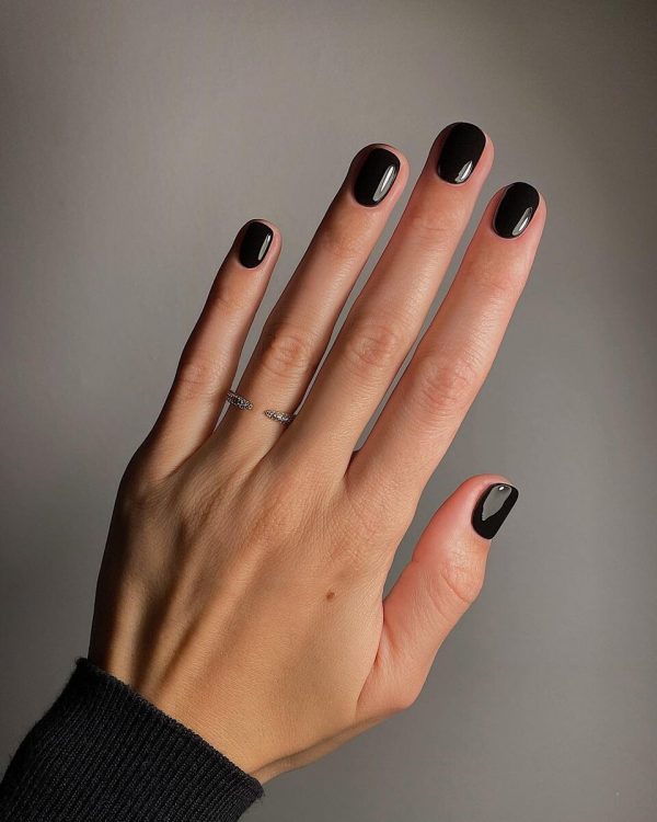 Однотонний чорний манікюр – класика, яка ніколи не виходить із моди. Тому любительки мінімалізму сміливо можуть зупинитись на такому варіанті.