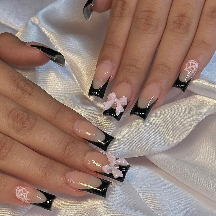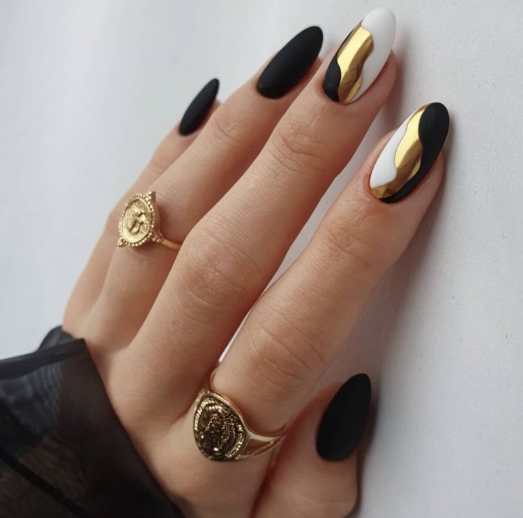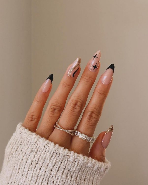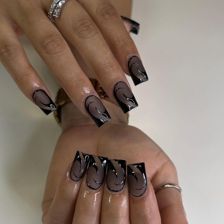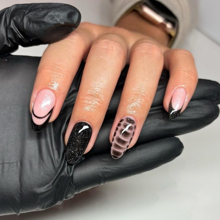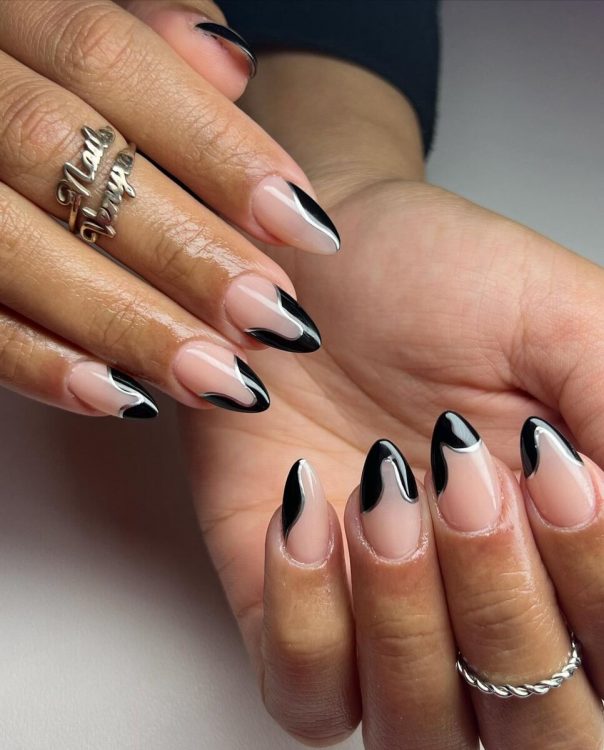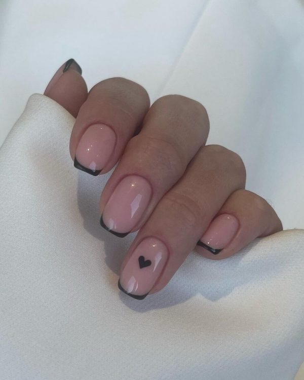 Якщо ви не хочете фарбувати весь ніготь темним лаком, можна зробити чорний манікюр із френчем. Достатньо замінити білу смугу на малюнок протилежного відтінку.