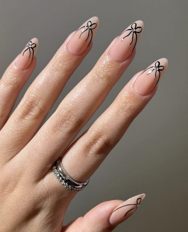 Підійдуть і рішення з мінімальними малюнками, виконаними світлим лаком на темному. Або чорний манікюр з акцентним нігтем – можна залишити одну нюдову пластину і нанести на неї зображення, наприклад, квіти або банти в естетиці coquette.