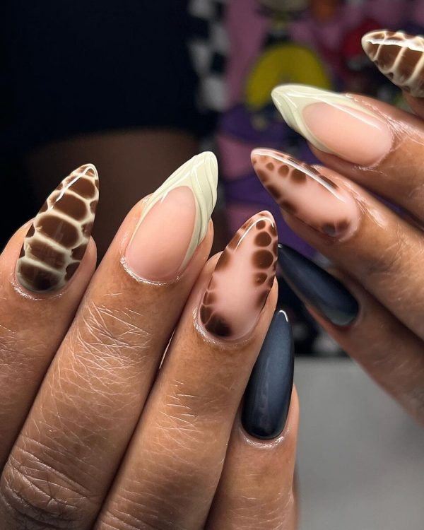 З лаком такого відтінку можна зробити трендовий дизайн в естетиці mob wife. Достатньо лише зупинитися на чорному манікюрі з тваринним принтом. Актуальні зміїний та черепаховий.