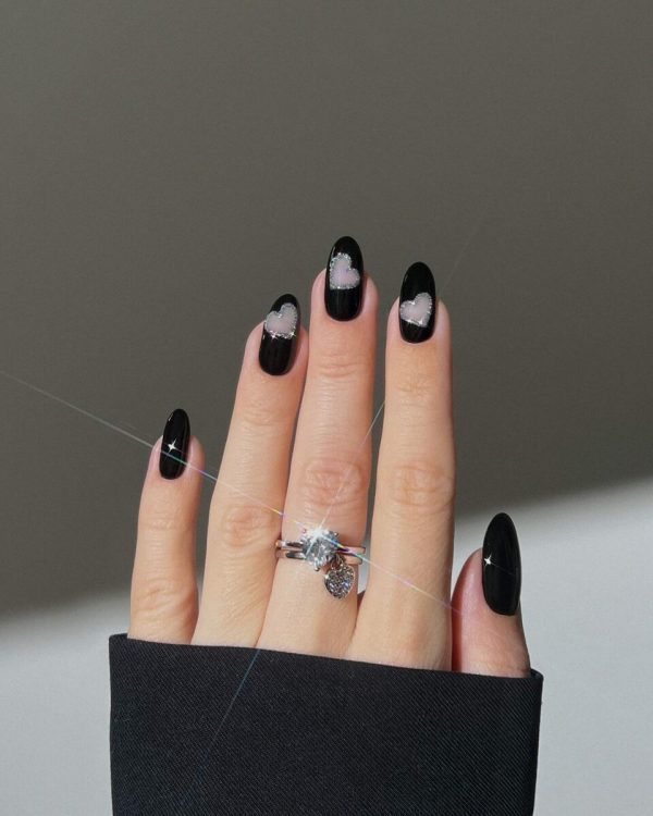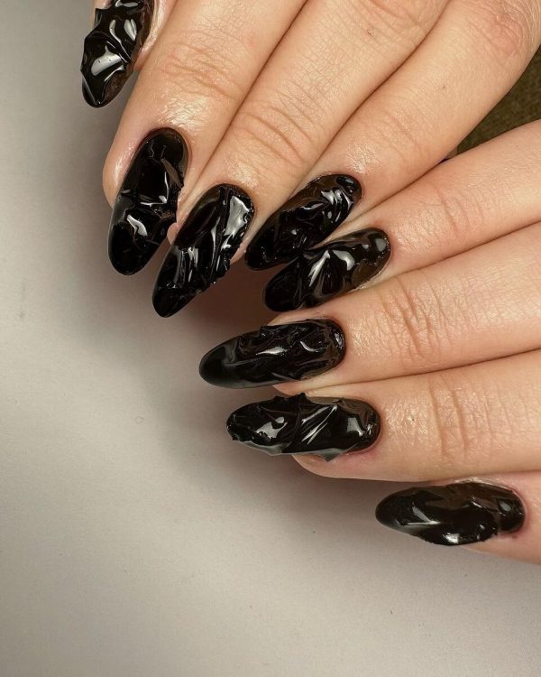 Зробити чорний манікюр ненудним допоможуть об’ємні наклейки. Наприклад, великі намистини чи банти в естетиці coquette. Актуальним є і азіатський манікюр “краплі води”, коли весь ніготь покривають фактурними фігурами з гелю.